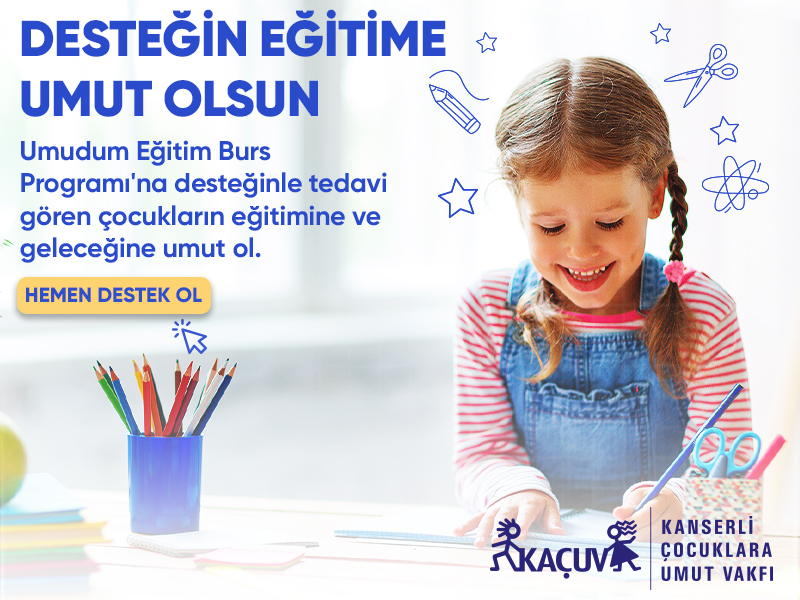 Kanserli Çocuklara Umut Vakfı (KAÇUV) olarak, Umudum Eğitim Burs Programı kapsamında kanser tedavisi görmüş ve eğitimini sürdürebilmek için maddi desteğe ihtiyaç duyan çocukların eğitimlerinin devamlılığını sağlıyoruz. Umudum Eğitim Burs Programı için bağış yap, daha çok çocuğa ulaşalım, umudu hep birlikte çoğaltalım.